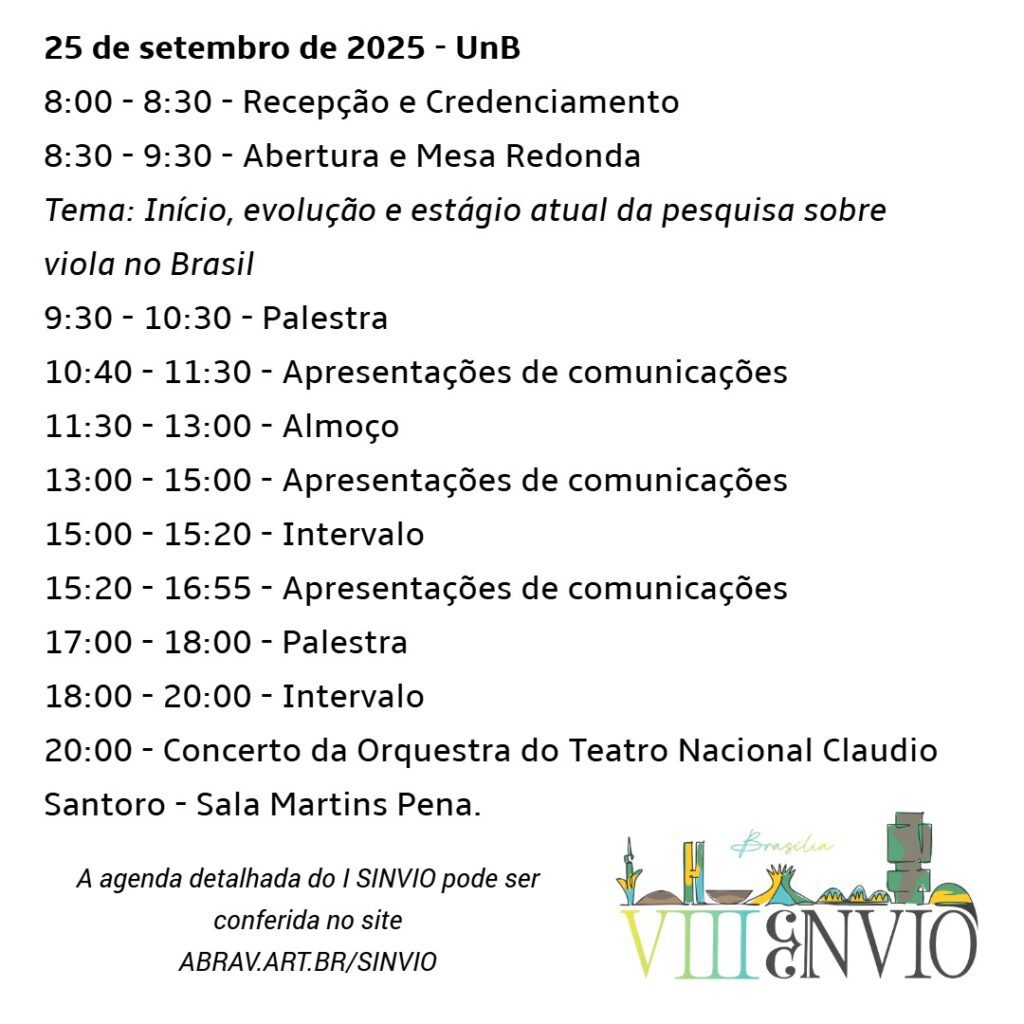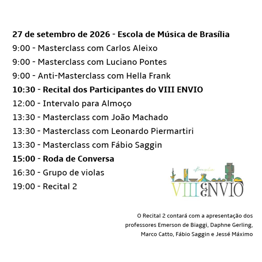 Em 2025 teremos o VIII ENVIO, que será realizado entre os dias 25 e 28 de setembro na UNB e na Escola de Música de Brasília. Confira abaixo a lista dos professores que participarão desse evento. Marquem em suas agendas essas datas, será um ENVIO imperdível!