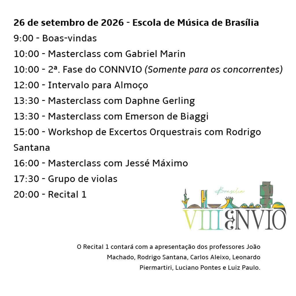 Alunos da Escola de Música de Brasília tem isenção para participar do VIII ENVIO, basta anexar o comprovante de matrícula no formulário de inscrição.
