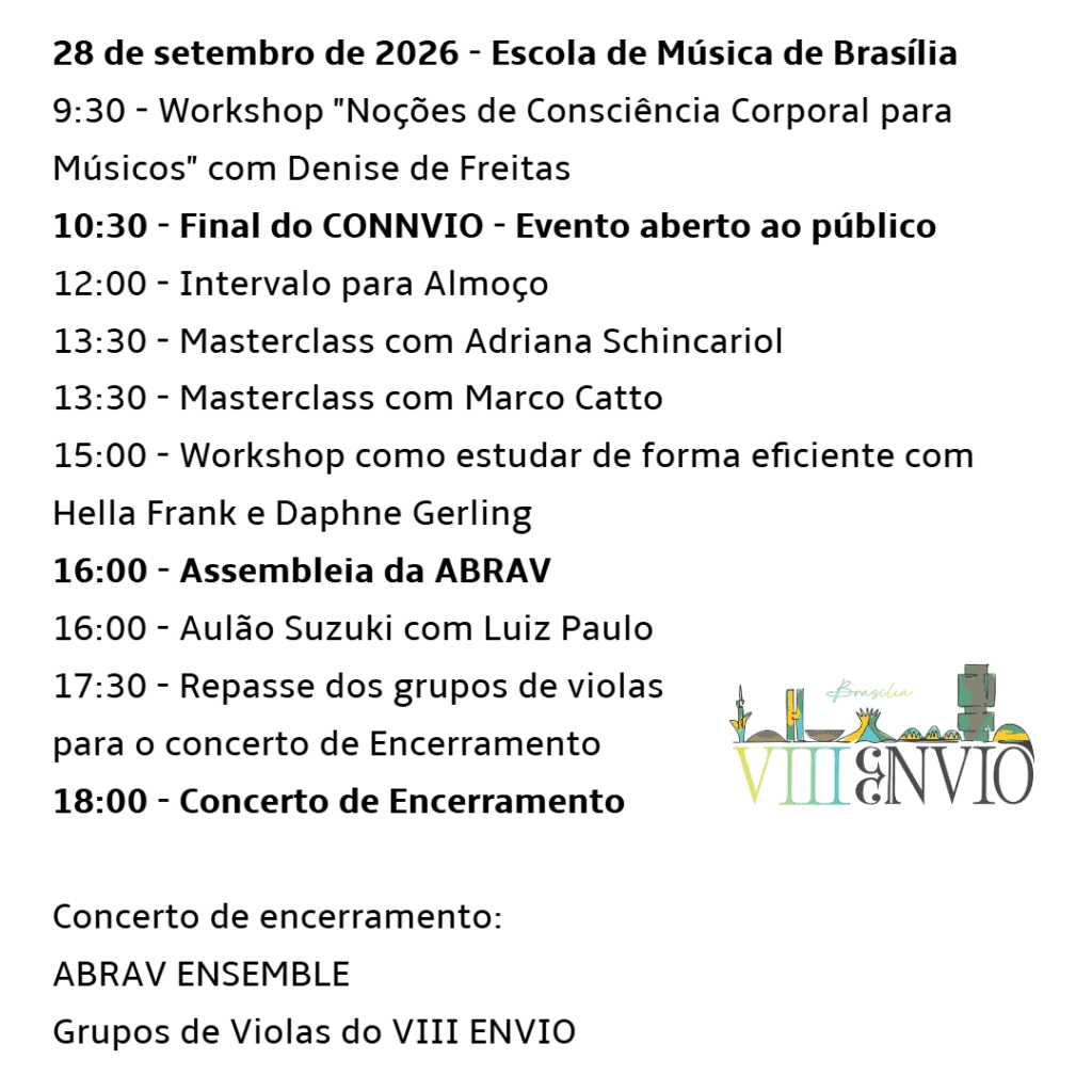 O ENVIO é o Encontro Nacional de Violistas realizado pela ABRAV, reunindo violistas de todo o Brasil. Durante alguns dias são realizadas atividades, aulas, palestras e concertos, com o intuito de promover o aprimoramento e a troca de informações relevantes à nossa prática.